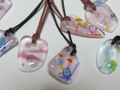 ミルフィオリのペンダントです、裏面は薬剤ですりガラス加工しているので色味のある洋服の上からでも付けられます!